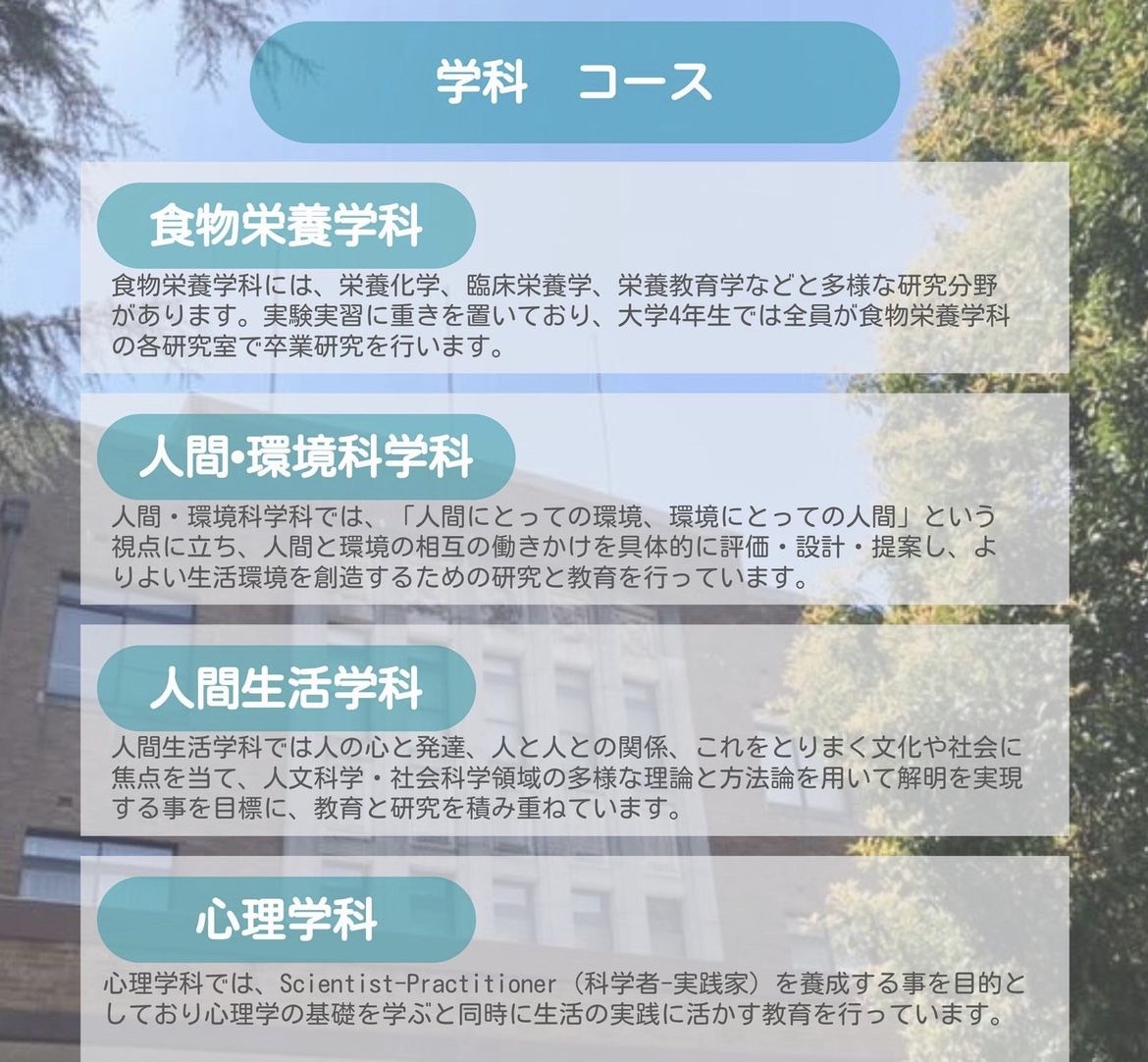 お茶大には文教育学部と理学部、生活科学部が存在しており、私は生活科学部に通っています。生活科学部に関して下記の写真を見ていただきたいです。